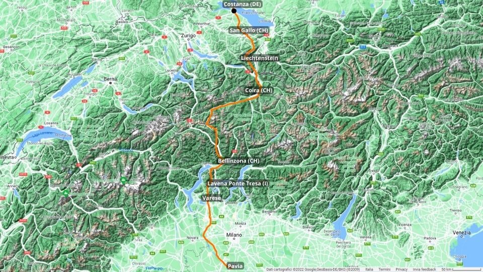 Dal punto di partenza in terra tedesca, vicino al confine svizzero, i chilometri totali sino a Pavia sono poco più di 500 e nelle tappe estere si toccano i Cantoni di San Gallo, Grigioni con la capitale Coira (raggiungibile anche dal Bernina Express, il famoso trenino rosso), Turgovia, Appenzello, Ticino.
